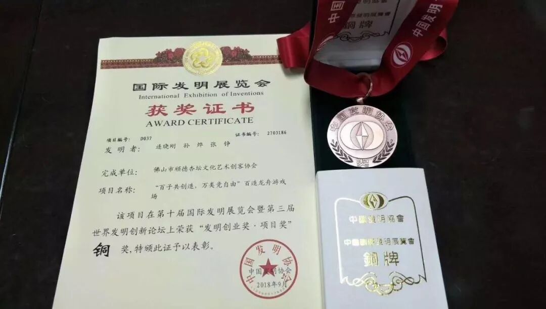 百造龙舟游戏场项目,于2018年9月13-15日,参与“发明实现梦想,创新引领未来”——第十届国际发明展览会暨第三届世界发明创新论坛,荣获“发明创业奖•项目奖”铜奖。同时,已获国家实用型设计发明专利。