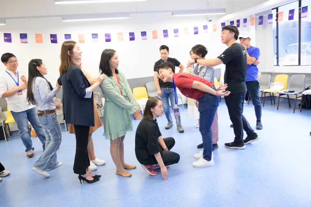 在导入课后,资深戏剧引导老师、即兴喜剧演员张旭引导大家破冰,在一系列热身活动后,张旭老师通过“Yes, and”模块式体验训练和迷你创意戏剧秀等方式潜移默化地向学员们传授团队合作的关键,即要鼓励他人、支持他人,先接受他人的想法再补充信息,专注当下,拥抱变化。